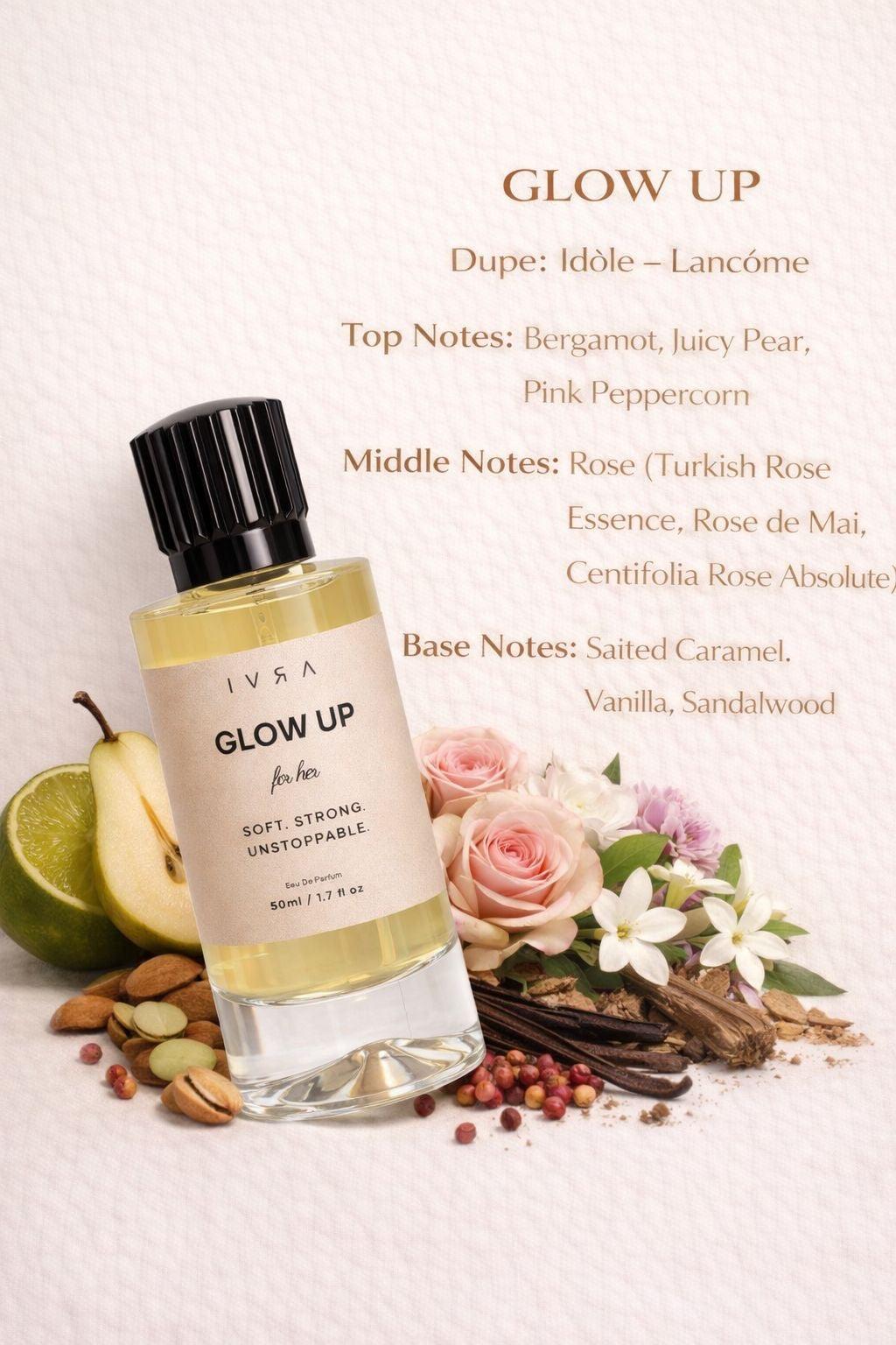 Fresh, feminine, and effortlessly powerful — Glow Up is the scent of stepping into your best self. Inspired by Lancôme Idôle, it brings the same radiant elegance at a fraction of the price. With uplifting notes of pear, rose, and white musk, this fragrance captures the essence of a modern icon: strong, soft, and unforgettable.